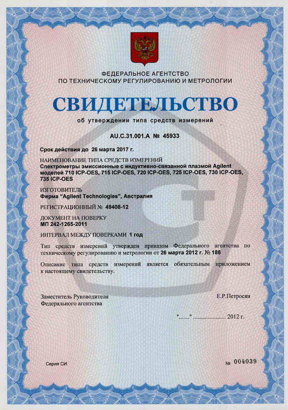Поверка спектрометра эмиссионного с индуктивно-связанной плазмой Agilent 710 ICP-OES, 715 ICP-OES, 720 ICP-OES, 725 ICP-OES, 730 ICP-OES, 735 ICP-OES