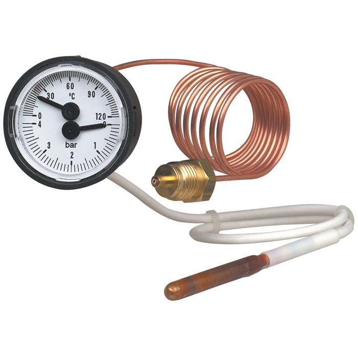 Термоманометр устанавливается в панель и позволяет измерять давление и температуру одновременно. Термоманометр имеет компактную конструкцию с передним фланцем и боковыми защелками, что позволяет легко устанавливать и встраивать его в эргономику приборных панелей. Капилляр упрощает возможность удаленного монтажа показывающей части прибора и измерительной точки.