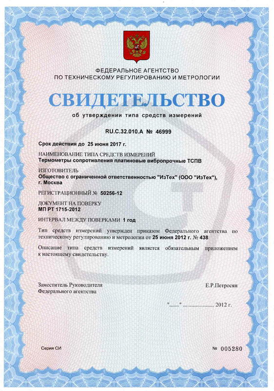 Термометры сопротивления платиновые вибропрочные ТСПВ предназначены для измерений температуры в диапазоне от минус 80°С до 500 °С. Термометры модификаций ТСПВ-1, ТСПВ-2, ТСПВ-3 соответствуют требованиям, предъявляемым к эталонам 3-го разряда по ГОСТ 8.558-2009; термометры модификаций ТСПВ-1.1,ТСПВ-2.1, ТСПВ-3.1 — рабочие повышенной точности с индивидуальной градуировочной характеристикой. Поверка термометра сопротивления платинового вибропрочного ТСПВ-1.1 осуществляется в аккредитованной лаборатории и занимает от 1 до 5 дней.