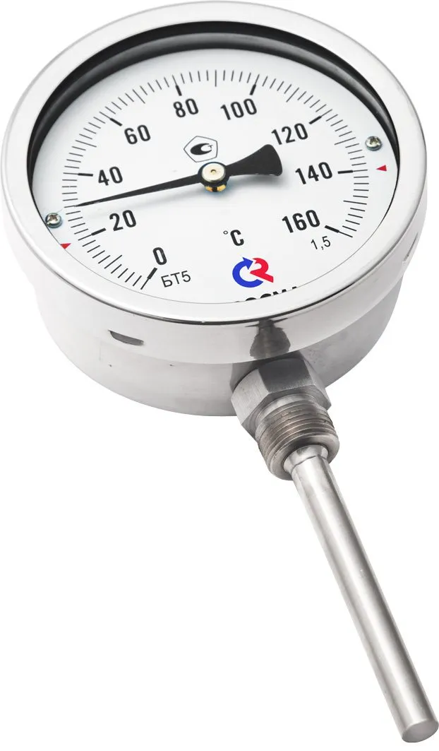 В термометре БТ в качестве термоэлемента используется биметаллическая пружина, находящаяся в нижней части штока прибора. Погрешность измерения температуры минимальна, если конец защитной гильзы или штока термометра (для термометров без гильзы) погружен на глубину не менее ⅓ и не более ⅔ внутреннего диаметра трубопровода. Различная глубина погружения термоэлемента может быть достигнута выбором длины приварной бобышки или погружной части биметаллического термометра. При монтаже прибора на трубопровод приваривается бобышка с внутренней резьбой. В бобышку вкручивается гильза термометра, а в гильзу устанавливается термометр. Термометр фиксируется в гильзе с помощью винта на шестиграннике гильзы. Резьбовые соединения уплотняются лентой ФУМ (при температуре измеряемой среды до +200°С); жгутом ФУМ (при температуре измеряемой среды до +250°С); льняной подмоткой (при температуре измеряемой среды свыше +250°С).
