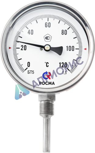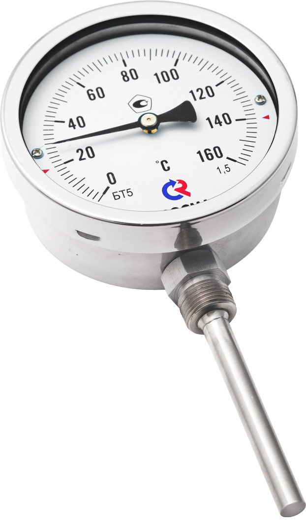 В термометре БТ в качестве термоэлемента используется биметаллическая пружина, находящаяся в нижней части штока прибора. Погрешность измерения температуры минимальна, если конец защитной гильзы или штока термометра (для термометров без гильзы) погружен на глубину не менее ⅓ и не более ⅔ внутреннего диаметра трубопровода. Различная глубина погружения термоэлемента может быть достигнута выбором длины приварной бобышки или погружной части биметаллического термометра. При монтаже прибора на трубопровод приваривается бобышка с внутренней резьбой. В бобышку вкручивается гильза термометра, а в гильзу устанавливается термометр. Термометр фиксируется в гильзе с помощью винта на шестиграннике гильзы. Резьбовые соединения уплотняются лентой ФУМ (при температуре измеряемой среды до +200°С); жгутом ФУМ (при температуре измеряемой среды до +250°С); льняной подмоткой (при температуре измеряемой среды свыше +250°С).
