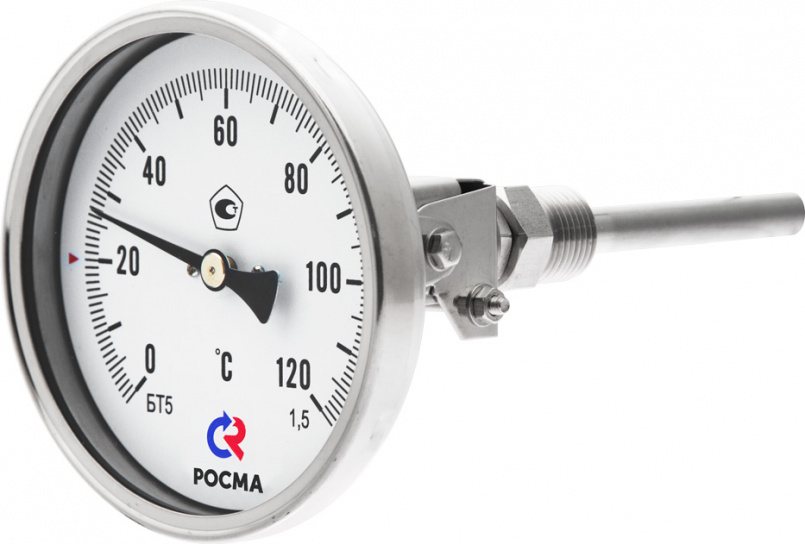 В термометре БТ в качестве термоэлемента используется биметаллическая пружина, находящаяся в нижней части штока прибора. Погрешность измерения температуры минимальна, если конец защитной гильзы или штока термометра (для термометров без гильзы) погружен на глубину не менее ⅓ и не более ⅔ внутреннего диаметра трубопровода. Различная глубина погружения термоэлемента может быть достигнута выбором длины приварной бобышки или погружной части биметаллического термометра.