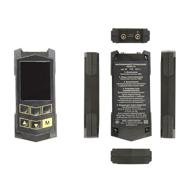 Внешне толщиномер представляет собой электронный блок прямоугольно-граненой формы, к которому с помощью разъемов Lemo подключаются преобразователи (совмещенные или раздельно-совмещенные). На передней панели расположен цветной TFT-экран и управляющая клавиатура.