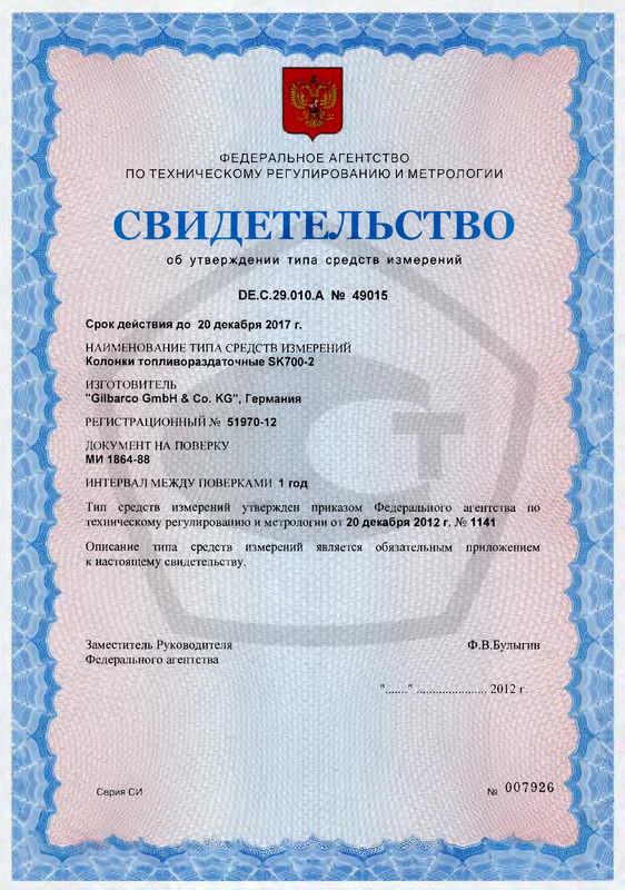 Поверка осуществляется по документу: МИ 1864-88 «Рекомендация. ГСП. Колонки топливораздаточные. Методика поверки».