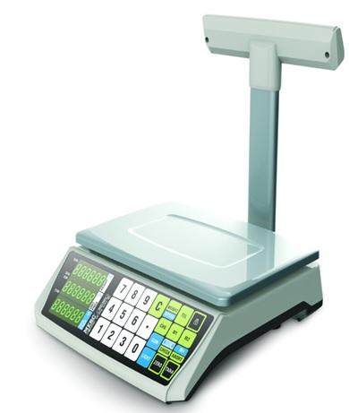 - с дисплеем и блоком клавиатуры, закрепленными на лицевой панели корпуса весов, и с дисплеем покупателя закрепленным на корпусе посредством стойки.