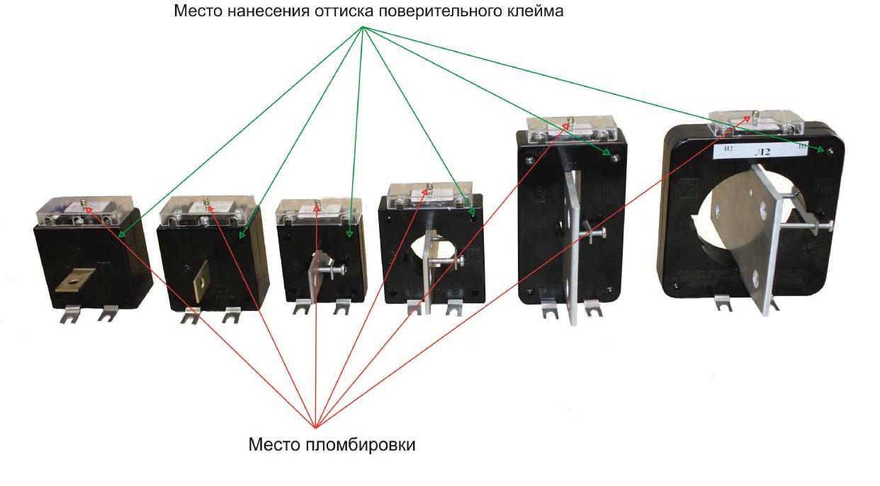 Для предотвращения доступа к вторичной обмотке и сердечнику трансформатора на корпусе в месте установки соединительных винтов корпуса предусмотрено место для нанесения оттиска поверительного клейма. Выводы вторичной обмотки трансформатора закрываются прозрачной пластиковой крышкой и пломбируются после установки трансформатора. Общий вид трансформаторов тока, места пломбировки и нанесения оттиска поверительного клейма изображены на рисунках 1 и 2.