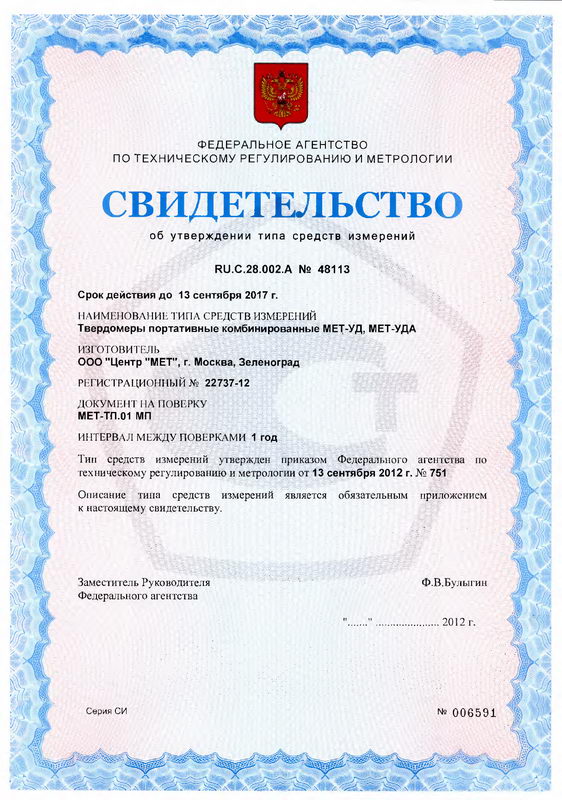 Поверка проводится в соответствии с документом “Твердомеры портативные ультразвуковые МЕТУ1, МЕТ-У1А, твердомеры портативные динамические МЕТ-Д1, МЕТ-Д1А, твердомеры портативные комбинированные МЕТ-УД, МЕТ-УДА. МЕТ – ТП.01 МП ”, утвержденным ГЦИ СИ ФГУП “ВНИИФТРИ” 24.08.2012 г.