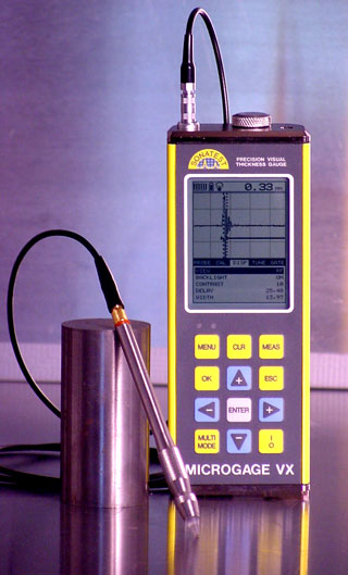 Ультразвуковой толщиномер модели Microgage II предназначен для измерения с высокой разрешающей способностью. В толщиномере модели Microgage VX добавлены функции сохранения результатов измерений и отображения А и В-сканов [развертка типа А; А-развертка; А-скан: форма представления ультразвукового сигнала на экране ультразвукового прибора, при котором ось абсцисс представляет время, а ось ординат — амплитуду; развертка типа В; В-скан: Изображение информативных сигналов в плоскости сечения объекта контроля, перпендикулярной поверхности ввода и параллельной плоскости падения волны].