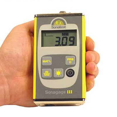 Толщиномер Sonagage III является идеальным ультразвуковым прибором для регулярного контроля толщины различных материалов. В ультразвуковом толщиномере Sonagage установлено 8 фиксированных значений скорости распространения ультразвука для основных материалов, а также предусмотрена установка пользователем двух собственных значений при помощи простого программного обеспечения, поставляемого в стандартном комплекте прибора. Дисплей толщиномера Sonagage обеспечивает легкое считывание информации даже в неосвещенном месте. На двух пальчиковых батарейках прибор работает в течение 200 часов. Поверка ультразвукового толщиномера Sonagage III осуществляется в аккредитованной лаборатории и занимает от 1 до 5 дней.