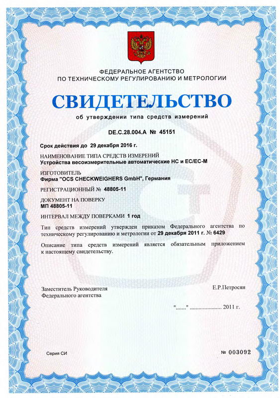Поверка осуществляется по документу МП 48805-11 «Устройства весоизмерительные автоматические HC и EC/EC-M фирмы «OCS Checkweighers GmbH», Германия. Методика поверки»», утвержденному ГЦИ ФГУП «ВНИИМС» в 2011 году.