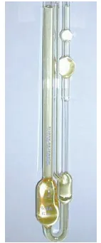 Сущность метода состоит в определении времени истечения определенного объема стандартного образца (градуировочной жидкости) под воздействием силы тяжести через капилляр калиброванного вискозиметра при воспроизводимом гидростатическом напоре и тщательно контролируемой известной температуре. Вискозиметры капиллярные стеклянные типа Уббелоде предназначены для измерения кинематической вязкости прозрачных жидкостей методом свободного истечения образца.