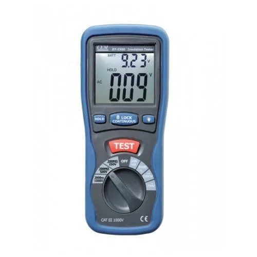 Мегаомметр DT-5505 используется для проверки изоляционных свойств электрооборудования и кабельной продукции, определяя сопротивление изоляции в диапазоне от 125 кОм до 4000 МОм. Имеется 4 предустановленных предела испытательных напряжений (125 В, 250 В, 500 В, 1 кВ) при постоянном значение испытательного тока 1мА. Мегаомметр DT-5505 также предназначен для измерения сопротивления цепи (40 Ом и 400 Ом) и напряжения постоянного (до 1000В) и переменного (до 750В) тока.