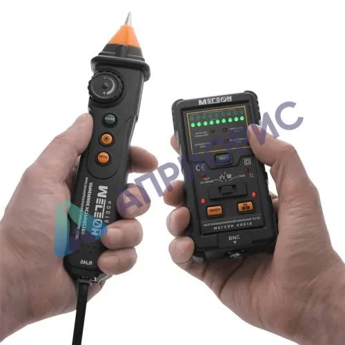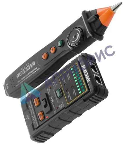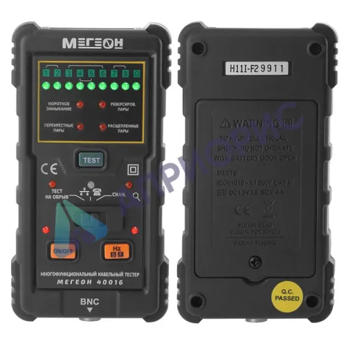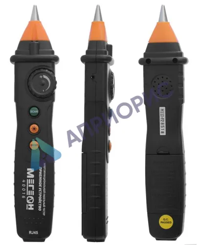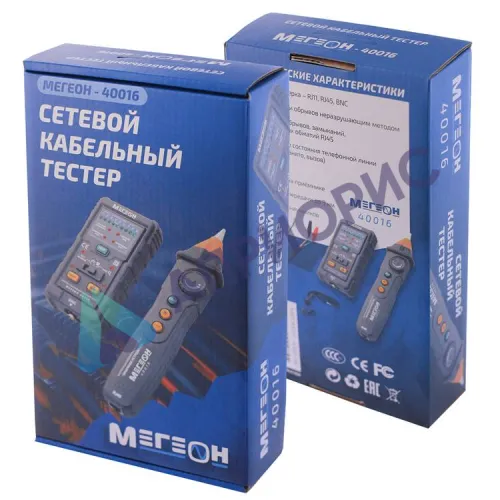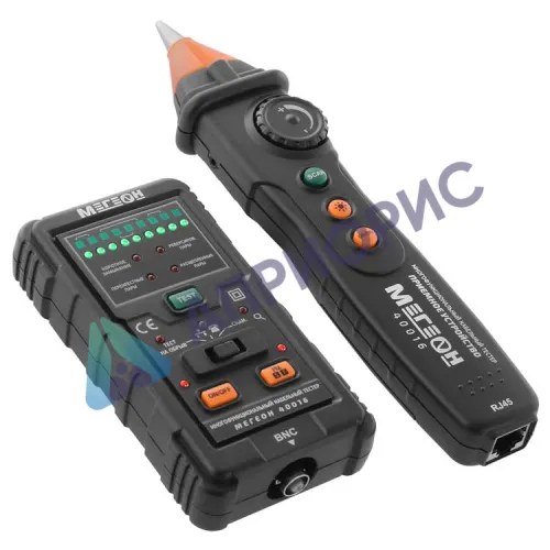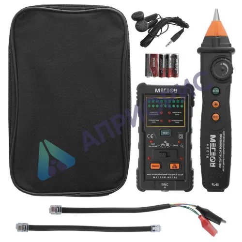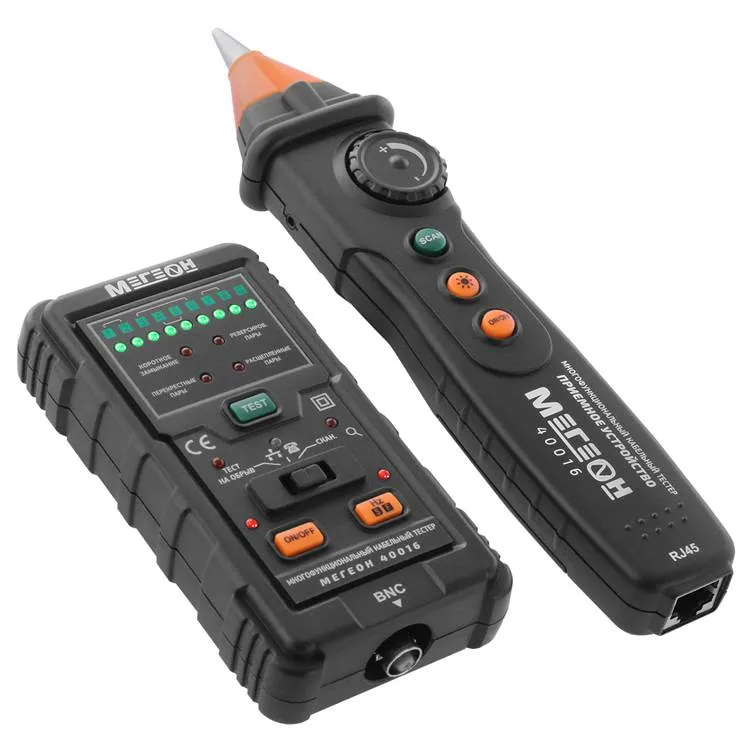 МЕГЕОН 40016 представляет из себя многофункциональный ручной кабельный тестер с расширенным перечнем совместимой проводки, расширенными возможностями и более широкой областью применения. К сновным функциям прибора можно отнести: возможность поиска проводника, подключенного к разъемам RJ11, RJ45 и BNC, а также других типов проводников при использовании переходника. При этом поиск проводника не требует снятия изоляции, что делает процесс более быстрым и удобным, а также дает возможность поиска точки разрыва проводника. Возможность осуществлять поиск проводника, подключенного к любому типу маршрутизаторов, коммутаторов и другому низковольтному оборудованию. Проверка целостности сетевого кабеля, порядка витой пары, выявление обрыва, короткого замыкания, перестановки пар, выявление реверсированных и расщепленных пар. Помимо этого предусмотрена проверка уровня напряжения полярности. Тестирование телефонных кабелей, идентификация режимов работы (свободно, вызов, занято) и идентификация выводов Tip и Ring («плюс» и «минус» линии). Устройство предназначается для инженерного персонала в сфере телекоммуникаций, специалистов по прокладке кабеля или техническому обслуживанию сетей.