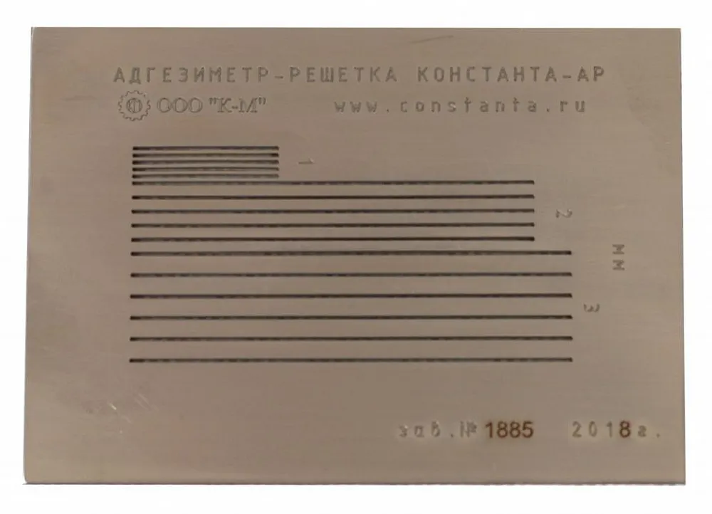 Адгезиметры выполнены в виде шаблона с нормированными прорезями, изготовленного из плоской пластины нержавеющей стали.