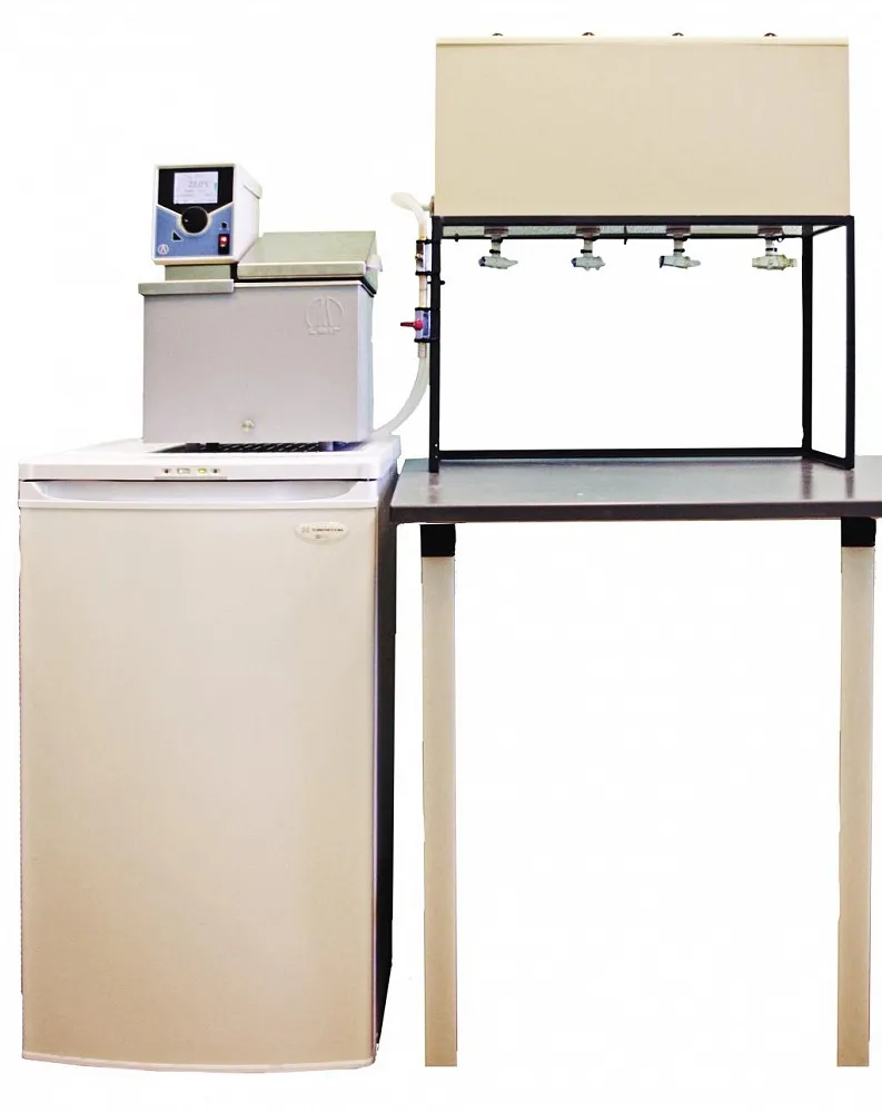 Принцип работы основан на поддержании необходимой температуры емкостей с контрольными жидкостями циркулирующей эксплуатационной жидкостью (водой) заданной температуры, омывающей эти емкости. Контрольные жидкости находятся в замкнутых алюминиевых цилиндрах, которые расположены в ванне и омываются эксплуатационной жидкостью заданной температуры. От емкостей с контрольными жидкостями эксплуатационная жидкость поступает в криостат-охладитель, далее в термостат, где подогревается до заданной по условиям испытаний температуры. Температура эксплуатационной жидкости в термостате поддерживается автоматически. От термостата эксплуатационная жидкость с помощью насоса снова подается в ванну.
