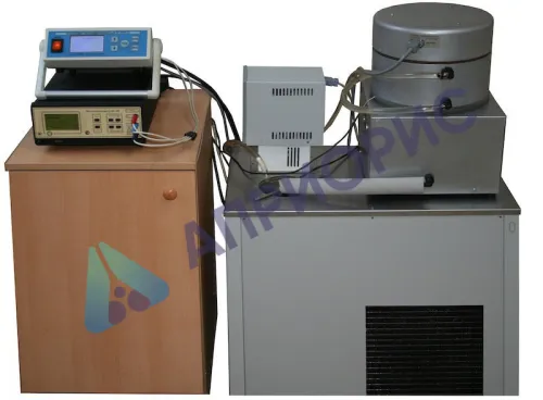 Создание и автоматическое поддержание стационарного и равномерного теплового потока заданной плотности в теплометрическом блоке обеспечивается за счет поддержания постоянной разницы температур верхнего нагревателя, температура которого задается и стабилизируется блоком управления, и нижнего холодильника, температура которого определяется теплоносителем, циркулирующим от термостата (поставляется по спецзаказу). Площадь рабочей зоны теплометрической камеры позволяет поверять одновременно до 18 датчиков теплового потока.