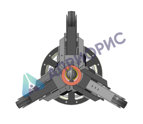 - Не отпуская из этого положения кольцо, сдвигаем муфту вдоль центрального стержня тележки в сторону моноблока. При этом ноги тележки раздвигаются, как спицы у зонтика, до тех пор, пока все три ноги не упрутся своими колесами во внутреннюю стенку трубы