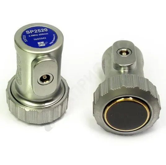 Преобразователь прямой совмещенный со сменными полиуретановыми протекторами. Для контроля изделий с грубой поверхностью. Диаметр 20мм, частота 2,5 МГц.