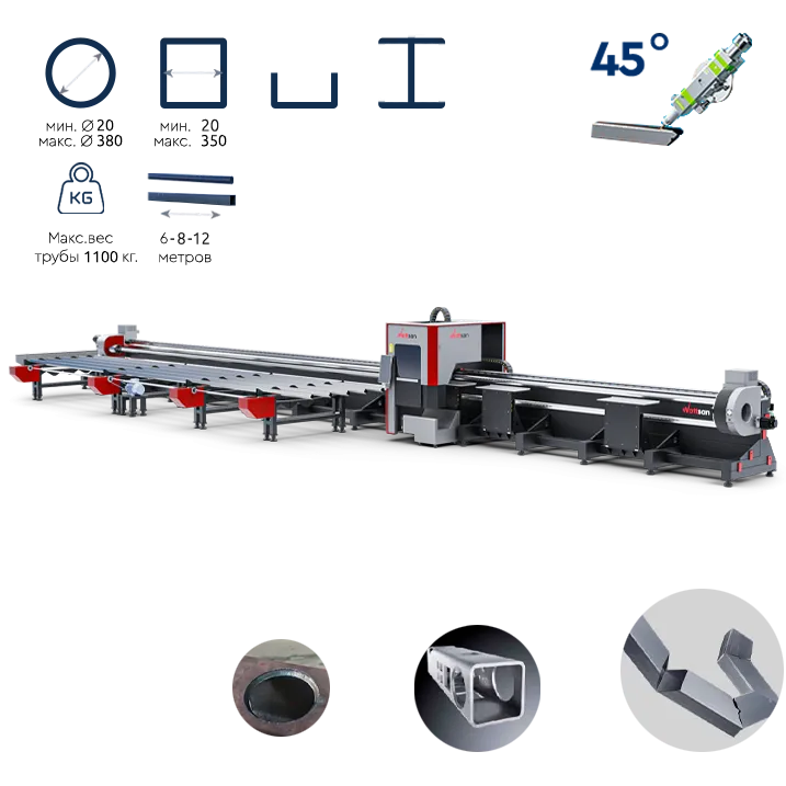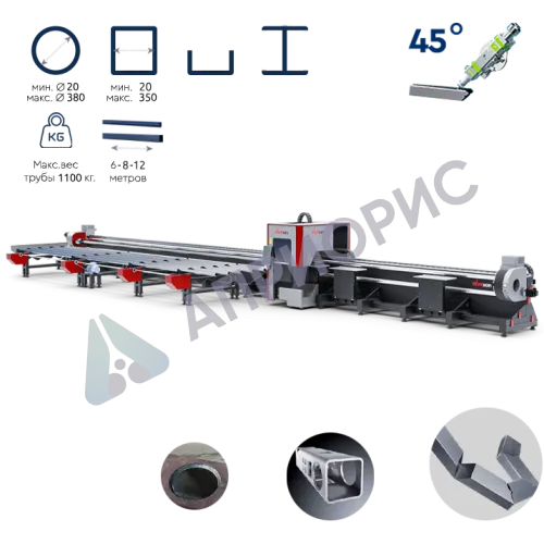 Дополнительно может быть укомплектован лазерной поворотной головой для резки под углом 45 градусов и модулем полуавтоматической загрузки труб.