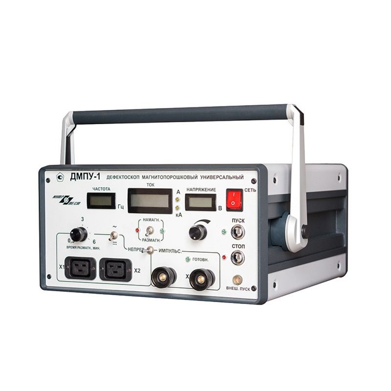 Дефектоскоп магнитопорошковый универсальный ДМПУ-1 предназначен для намагничивания изделий или их участков в режимах импульсного, переменного, постоянного поля. Импульсное намагничивание производится пропусканием тока по участку объекта или кабелем, намотанным на изделие. Намагничивание постоянным и переменным полем производится катушками или электромагнитом. Для всех режимов предусмотрено размагничивание.