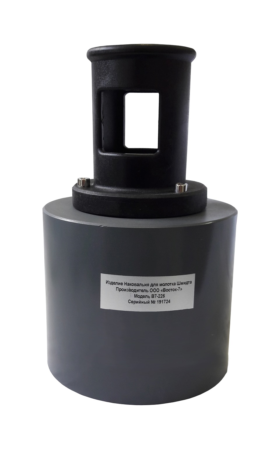 Наковальня состоит из массивного цилиндрического основания, в которое запрессована тестовая пластина из закалённой инструментальной стали, и направляющей гильзы, закреплённой на основании и обеспечивающей строго перпендикулярное положение склерометра при ударе.