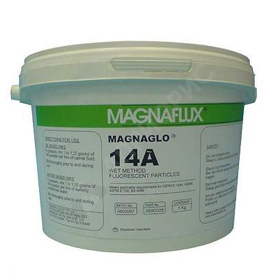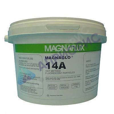 люминесцентный магнитный концентрат для приготовления люминесцентной магнитопорошковой суспензии мокрым способом. Использование при проведении магнитопорошкового контроля Magnaglo 14A позволяет гарантировано выявлять в ферромагнитных материалах наличие и местонахождение поверхностных и подповерхностных несплошностей типа флокенов, раковин, сварочных дефектов, шлифовочных, закалочных и усталостных трещин и др. Люминесцентный магнитный концентрат предназначен для приготовления суспензии на водной или масляной основе для люминесцентного контроля. Благодаря наличию в люминесцентном магнитном концентрате флюоресцирующих частиц на контролируемом объекте создается хорошо видимый индикаторный рисунок ярко зеленого свечения. Преимуществом люминесцентного контроля является то, что после удаления излишков пенетранта не требуется нанесения проявителя. При добавлении в люминесцентный магнитный концентрат присадки обеспечивается агрегативная устойчивость, хорошее поверхностное смачивание, более высокая чувствительность контроля и антикоррозийная защита контролируемой поверхности. При проведении люминесцентного контроля необходимо использовать источники УФ-освещения.