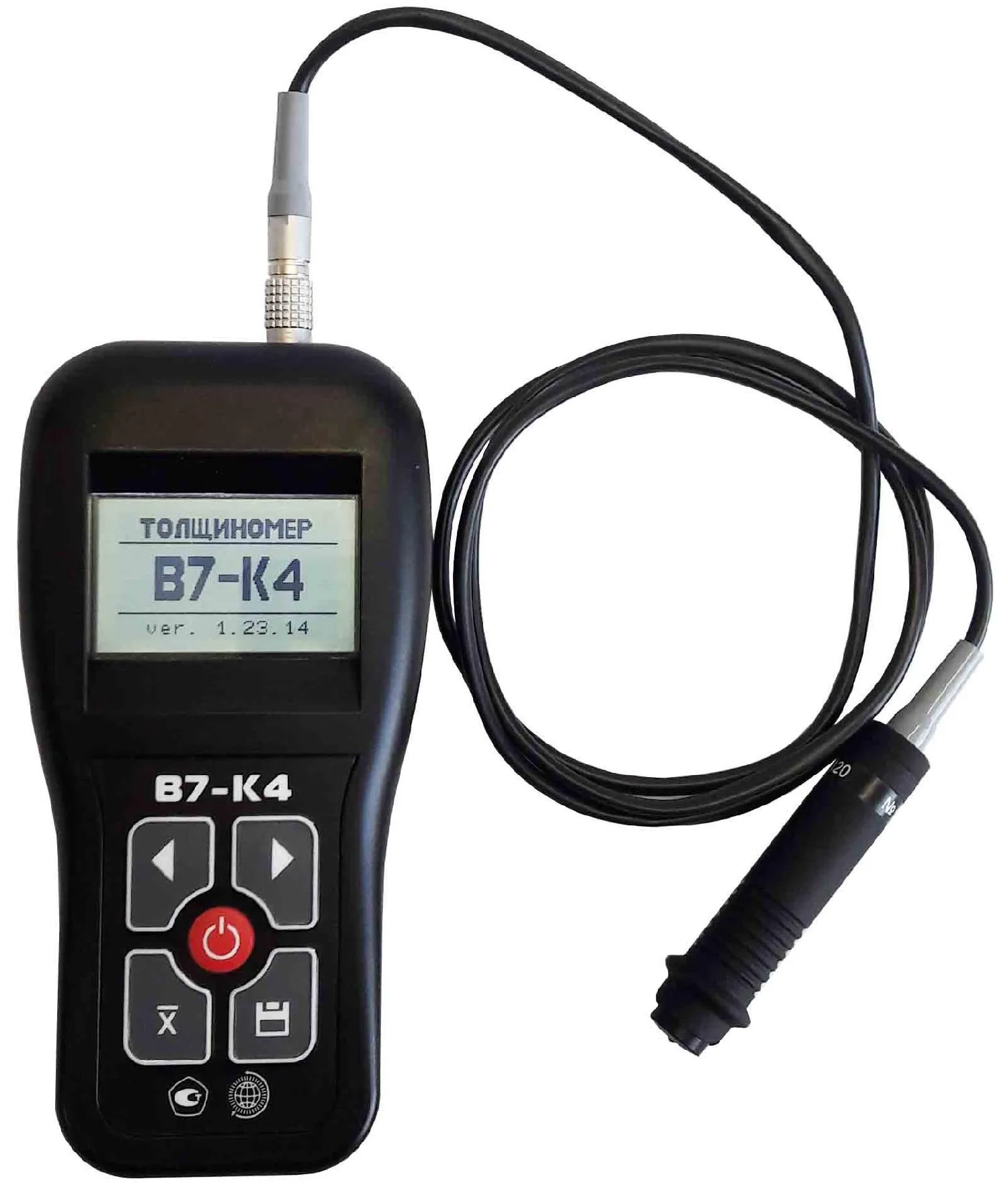 Толщиномеры покрытий модификации В7-К4 с выносным (съёмным) датчиком совмещают два режима работы: магнитный (на низкой частоте) для контроля покрытий на ферромагнитном основании и вихретоковый (на высокой частоте) для контроля покрытий на неферромагнитном основании. Применяются с разными преобразователями в зависимости от требований измерений: