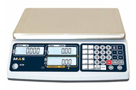 Торговые электронные весы MAS MR1 используются для измерения веса и расчета стоимости различных товаров по измеренной массе и введенной цене. Стоимость, цена и масса высвечивается на 3-х индикаторах дисплея, как со стороны продавца, так и со стороны покупателя. Область применения - это предприятия общественного питания, торговые организации, почта, различные виды сельскохозяйственных предприятий, производственные компании и иные отрасли народного хозяйства.